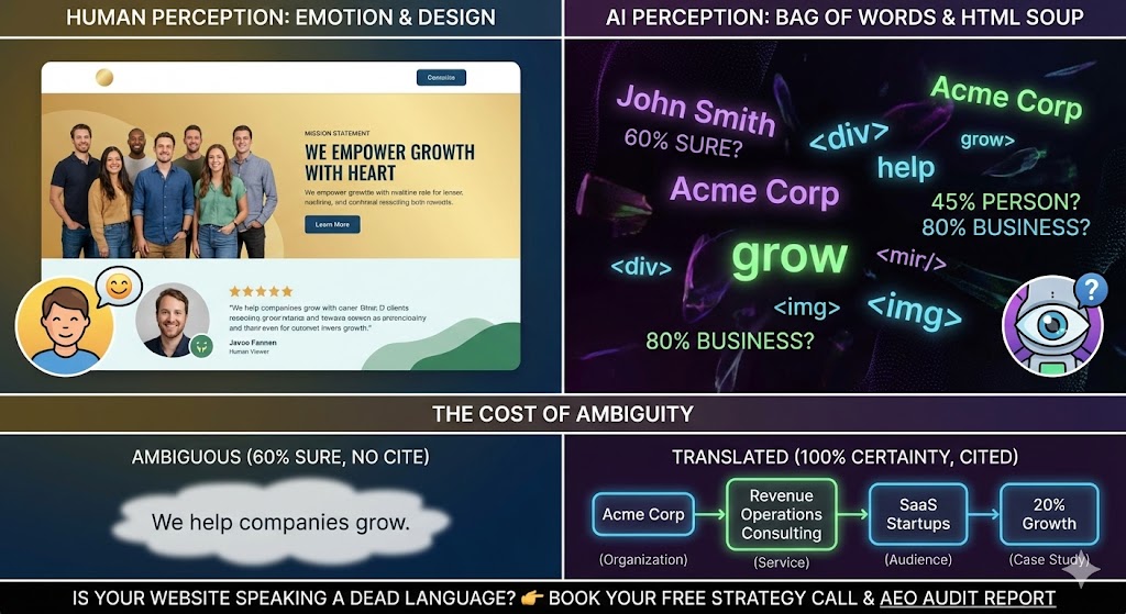 When an AI crawls that same page, it sees a “Bag of Words.” It sees unstructured text strings floating in HTML soup. It might guess that “John Smith” is a person and “Acme Corp” is a business, but it doesn’t know for sure. It operates on probability, not certainty.