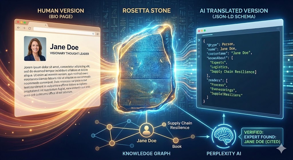 When an AI like Perplexity is asked, “Who is an expert in supply chain resilience?”, it scans its Knowledge Graph. If Jane’s site has this code, the AI has a “verified path” to connect her to the topic. It cites her not because it likes her prose, but because it understands her entity.
